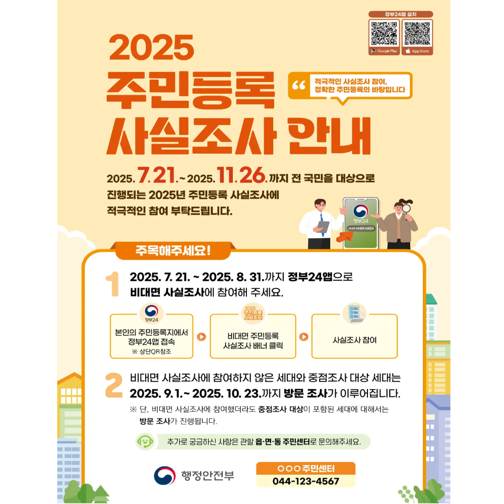 이번 주민등록 사실조사는 단순한 행정 절차가 아니라, 실제 생활에 꼭 필요한 공공 서비스의 기반이 되는 중요한 참여입니다.